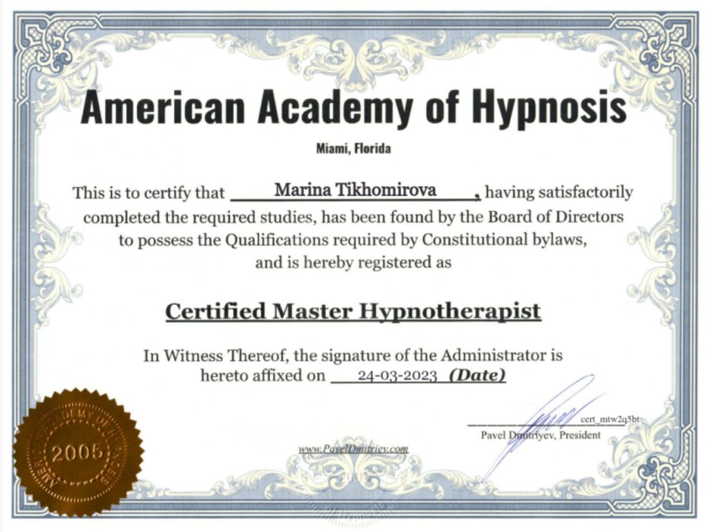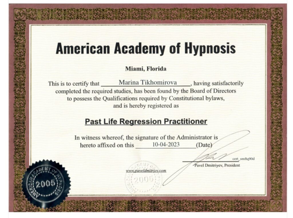 Практикующий Регрессолог, Гипнотерапевт, специалист American Academy of Hypnosis, Эксперт Holistic Mind therapy, Beauty coach, Nutrition, Психосоматолог.